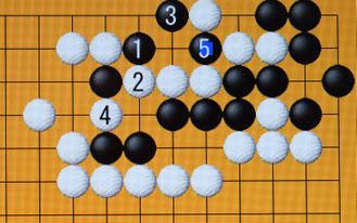 上図 黒1のハネ出しから3が好手。黒5ホーリコミ、白がその左に一子抜いたところが下図です。