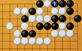 下図 黒1とアタリにすれば白はツグことができません。この2子が落ちれば黒の欠目が解消して生きです。