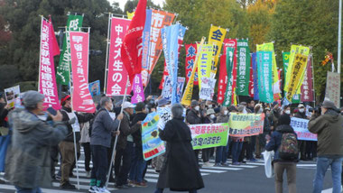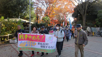 対米英開戦の日、杉並パレードが行われた。武力で平和は作れない!戦争NO!軍拡反対!蚕糸の森公園から杉並区役所―阿佐ヶ谷駅をパレード。呼びかけは、9条の会・杉並連絡会、杉並市民アクション他。参加者は130名。